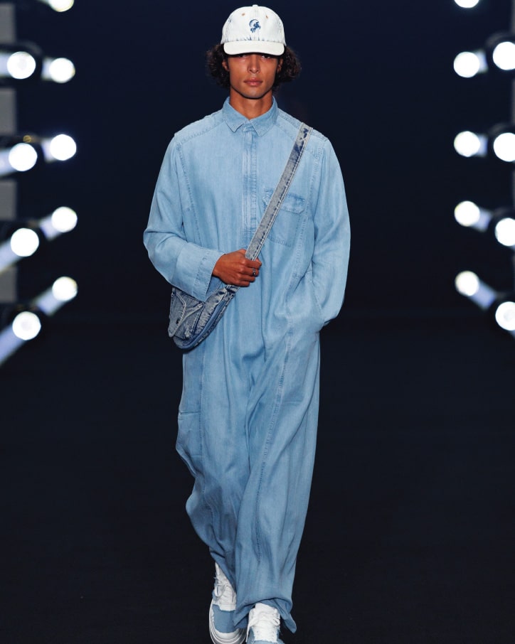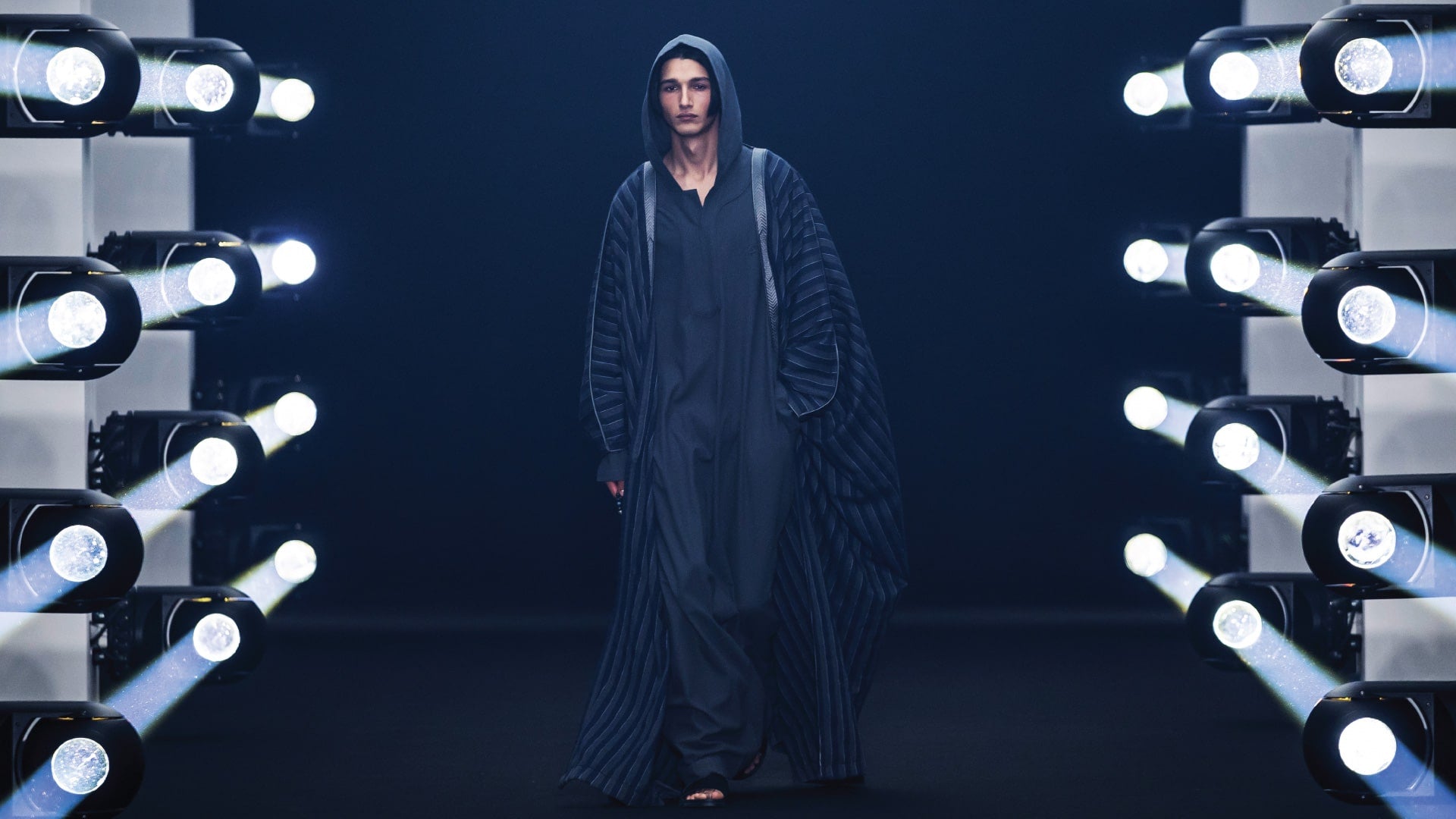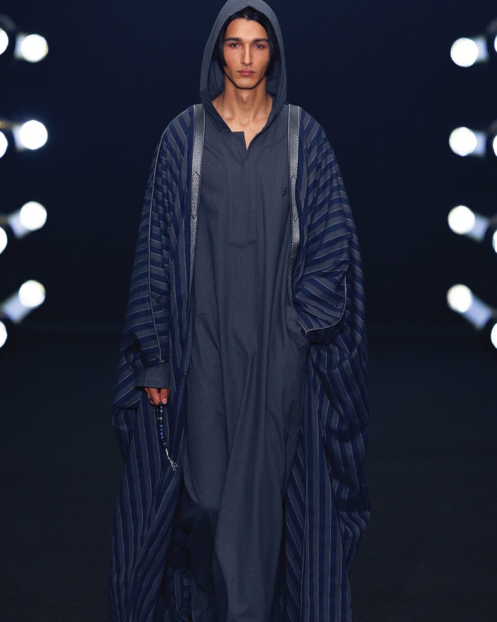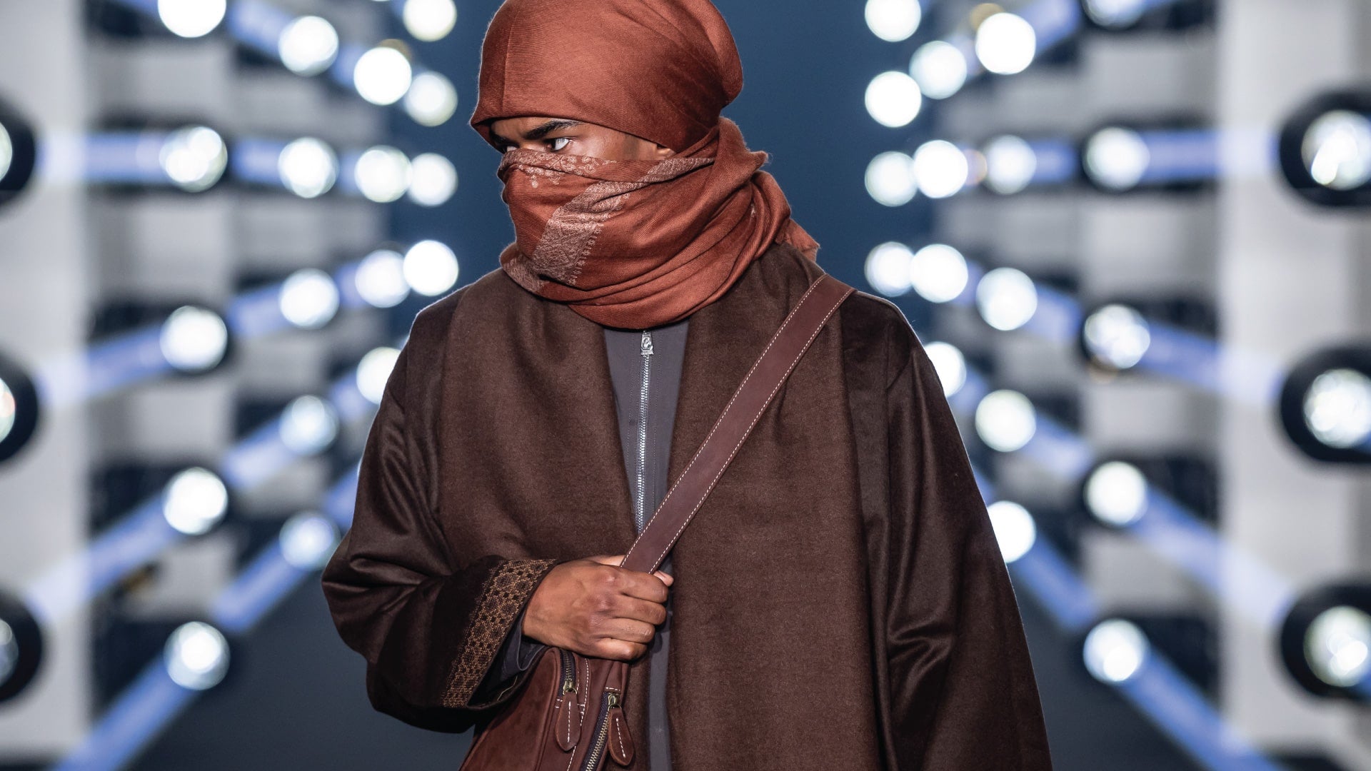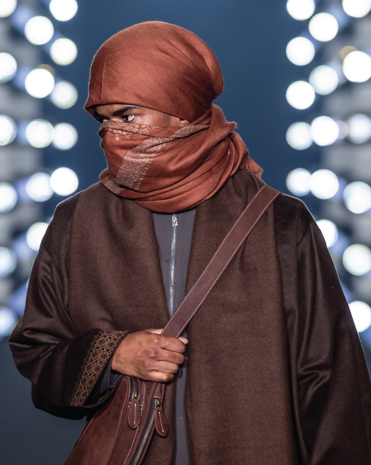 The thobe meets denim: distressed finishes, layered coats, and saddle-inspired leather trims. A collision of endurance and innovation.