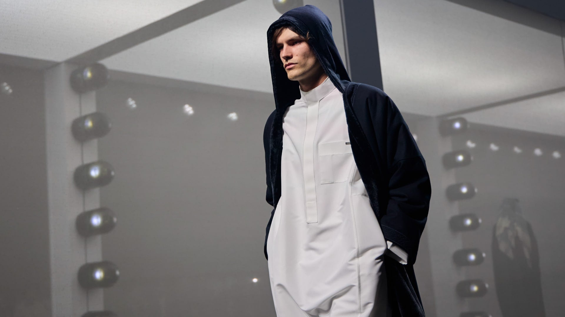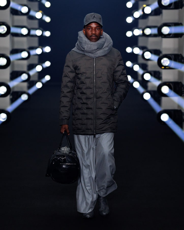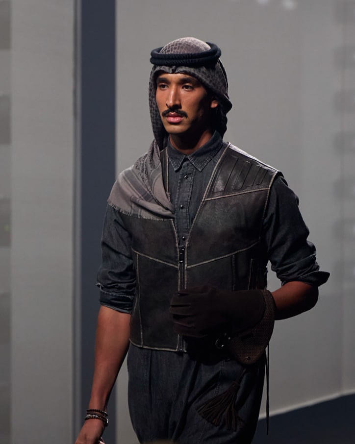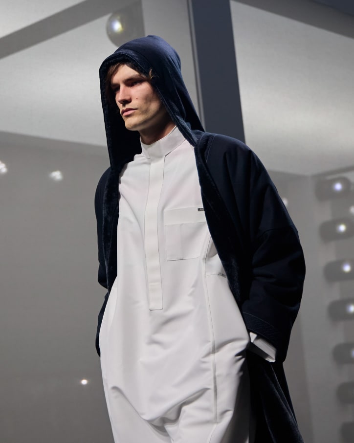 Layered thobes, puffer jackets, and farwas in navy, black, and grey tones. Accented with leather saddle bags, duffle silhouettes, and refined cold-weather tailoring.
