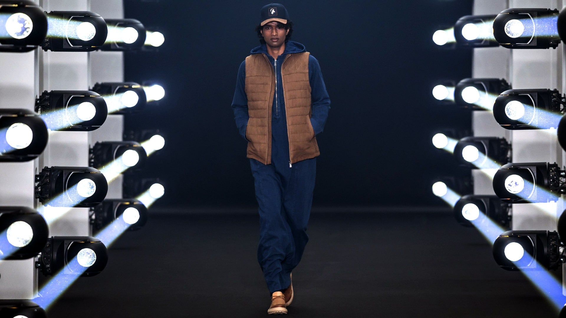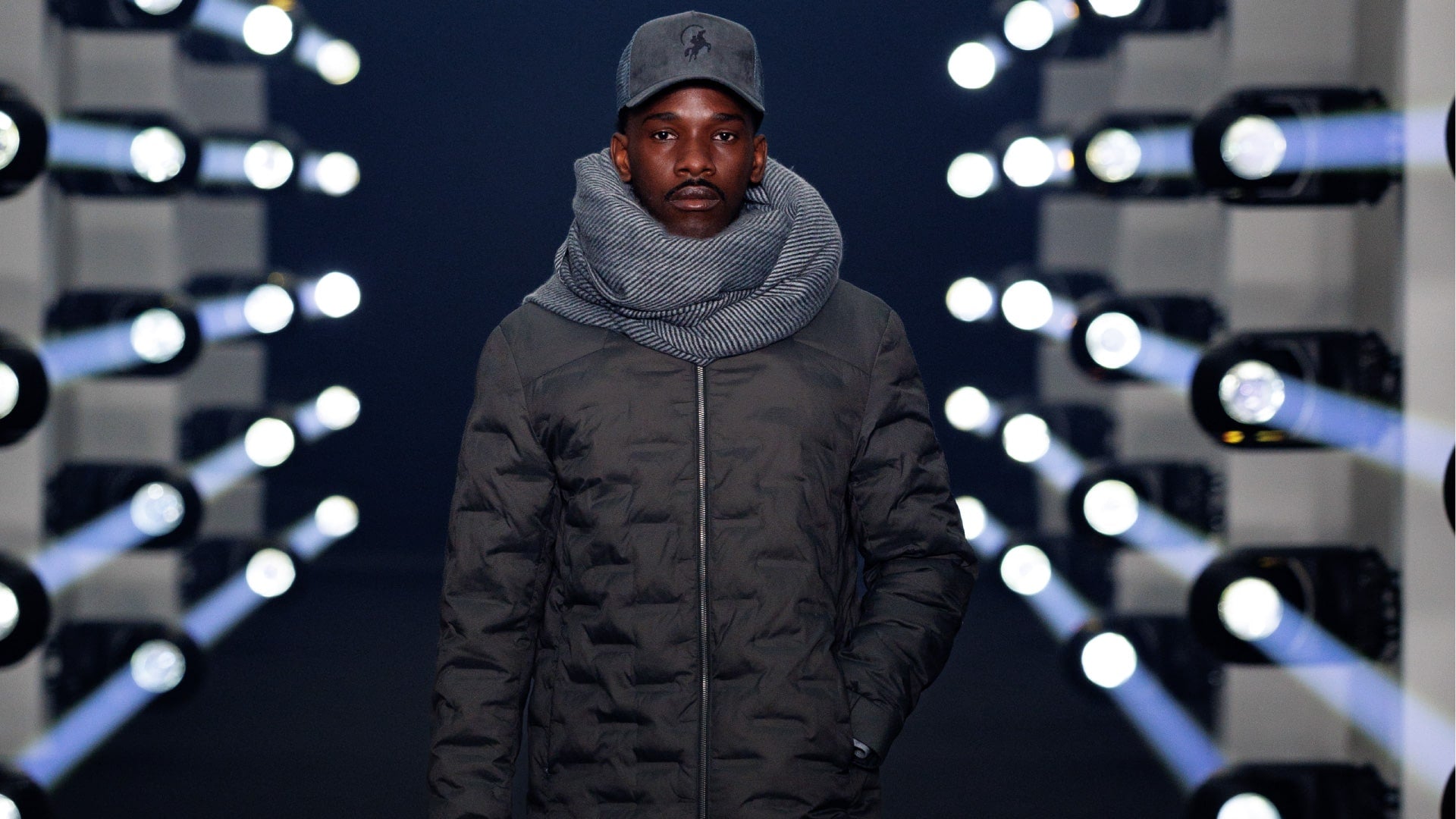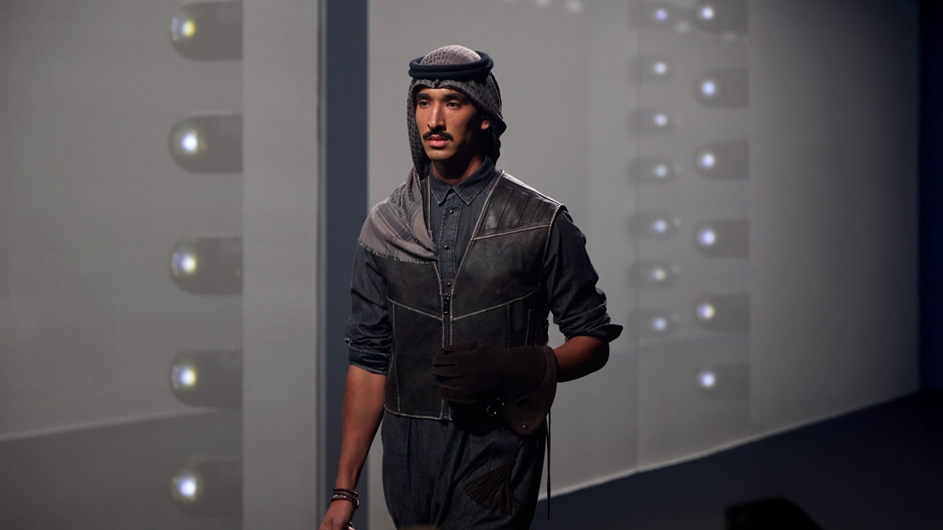Layered thobes, puffer jackets, and farwas in navy, black, and grey tones. Accented with leather saddle bags, duffle silhouettes, and refined cold-weather tailoring.