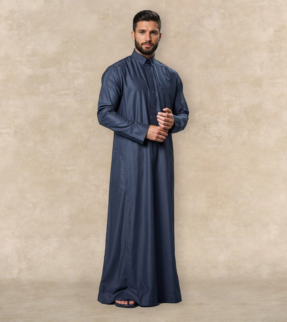 يتميز هذا الثوب الجاهز للارتداء بتصميم كلاسيكي، ويأتي بياقة قلاب أنيقة بتصميم إيطالي، و أزرار كلاسيكية على الزرزور، وأكمام عادية. مصنوع من قماش عالي الجودة 88% بوليستر و 12% فيسكوز. مصمم بإحترافية ليترك انطباعًا لا يُنسى.